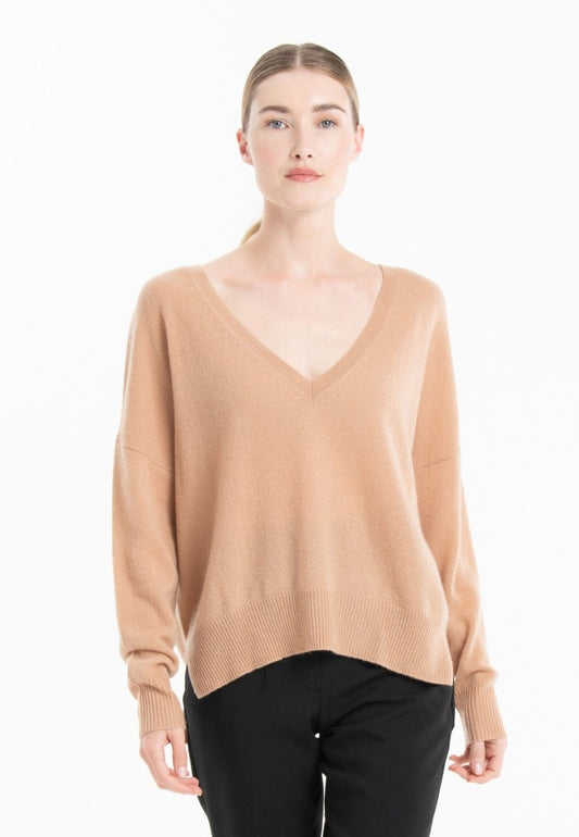 Pull col V femme en cachemire camel clair & beige - NAMI 23
