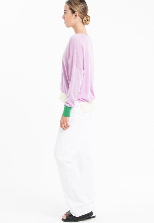 Pull col V femme en cachemire blanc écru & violet - RIA 1