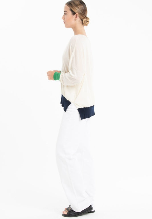 Pull col V femme en cachemire & laine ultrafin blanc & vert & bleu marine - KELLY 10
