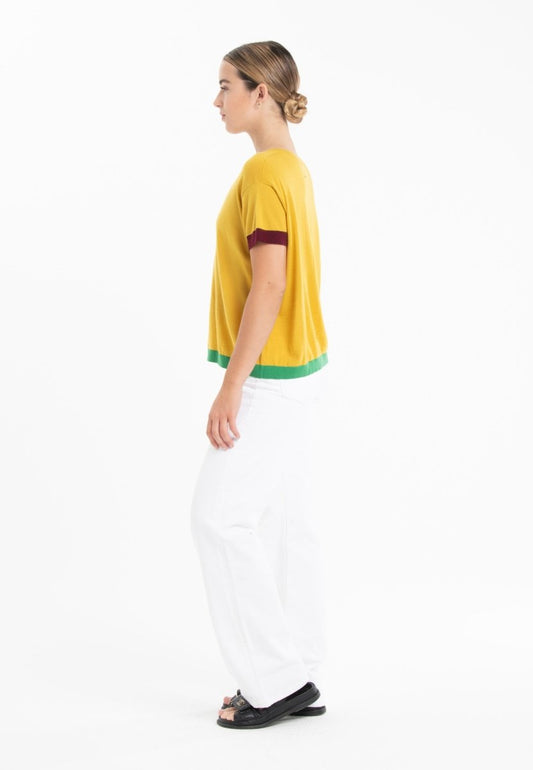 T shirt col rond manches courtes femme en cachemire & laine ultrafin noir & jaune - KELLY 1