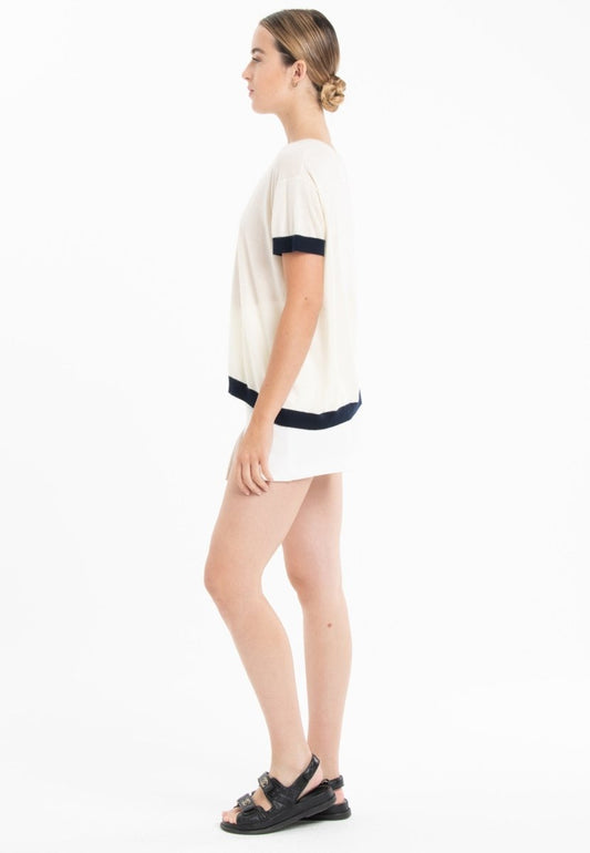T shirt col rond manches courtes femme en cachemire & laine ultrafin blanc & bleu marine - KELLY 1