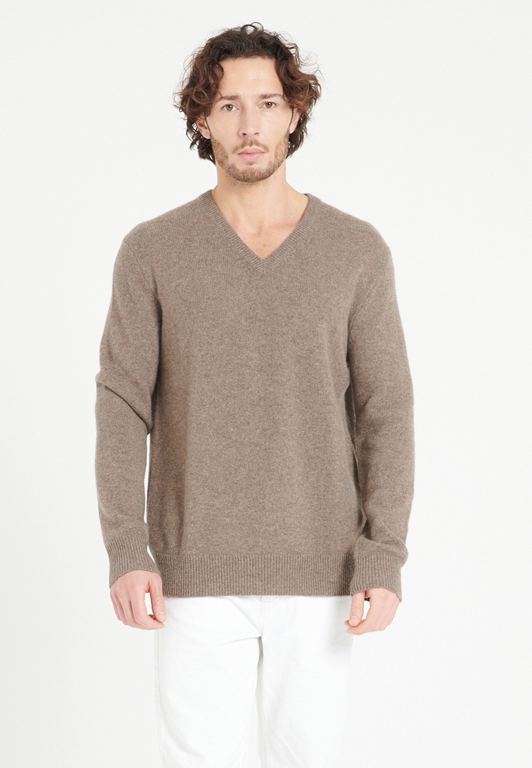 Herrenpullover aus 4-fädigem, taupefarbenem Kaschmir mit V-Ausschnitt - LUKE 13