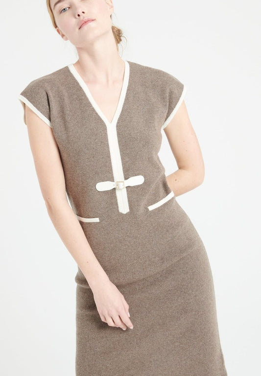 Women's taupe/ecru cashmere V-neck midi dress - MIA 2