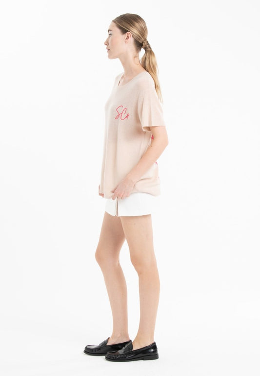 Women's embroidered neon yellow cashmere crew neck T-shirt - KELLY 15