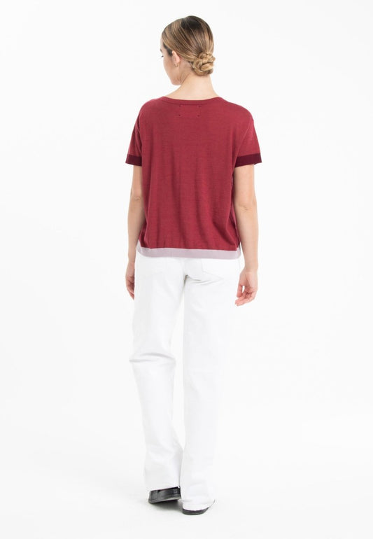 Ultrafine tricolor cashmere and wool crew neck t-shirt red/burgundy red/purple - KELLY 8