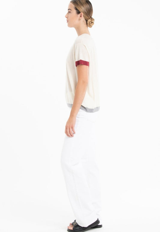 Women's ultra-fine tricolor round neck T-shirt in cashmere and wool, white/red/grey - KELLY 8
