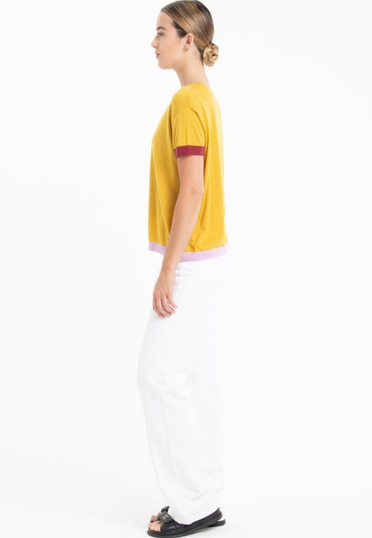 Women's ultra-fine tricolor cashmere and wool crew neck t-shirt in yellow/red/lavender - KELLY 8