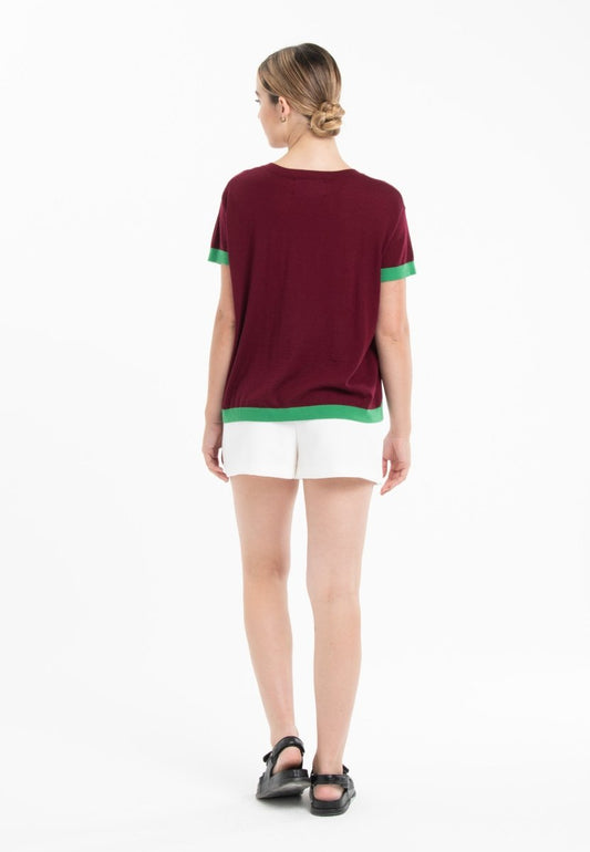 Women's ultra-fine cashmere and wool crew neck t-shirt in burgundy red/green - KELLY 1